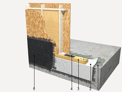 Recolzament de mur estructural d'entramat lleuger de fusta, sobre fonamentació de formigó, format per: impermeabilització de la fonamentació amb làmina bituminosa autoadhesiva, de 1 mm d'espessor, d'aplicació en fred, de fins a 60 cm de desenvolupament; recolzament de l'estructura mitjançant dorment de 38x89 mm de secció, de fusta de pinastre (Pinus pinaster), tractada en autoclau, amb classe d'ús 4, segons UNE-EN 335, acabat raspallat, amb humitat inferior al 20%, fixat a la fonamentació amb cargols estructurals d'acer zincat; protecció de l'estructura enfront de la humitat per capil·laritat amb banda de segellat de cautxú sintètic EPDM de 100 mm d'amplada; i impermeabilització exterior de la trobada amb làmina bituminosa autoadhesiva, de 1,5 mm d'espessor, d'aplicació en fred, de fins a 40 cm d'amplària. | ||
