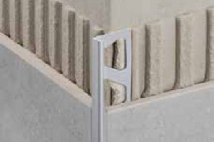 Cantonada exterior amb perfil d'alumini anoditzat, acabat natural, Schlüter-JOLLY-J 60 AE "SCHLÜTER-SYSTEMS", de 6 mm d'altura, en revestiment exterior amb peces ceràmiques. SUPORT: parament vertical. COL·LOCACIÓ: amb el mateix material que les peces ceràmiques.