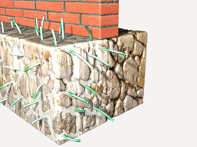 | Beurada de ciment injectada a pressió, en la fonamentació de maçoneria en sec, graves o reble, per a recalçament de fonamentació | ||