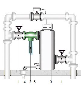 Descalcificador compacte amb comandament per temps de tres cicles, cabal de 0,3 m³/h, amb claus de pas de comporta. | ||